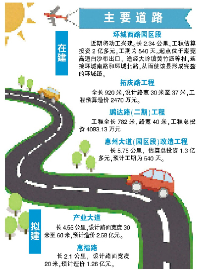 据了解,除目前正紧张进行前期工作的环城西路园区段工程外,园区还紧张进行拓庆路工程、鹏达路(二期)工程以及惠州大道(园区段)改造工程。其中拓庆路工程全长920米,设计路宽30米至37米,工程预算造价2470万元。鹏达路(二期)工程全长782米,路宽40米,工程总投资4093.13万元。而惠州大道园区段改造工程长5.75公里,估算总投资1.3亿多元,预计工期为540天。